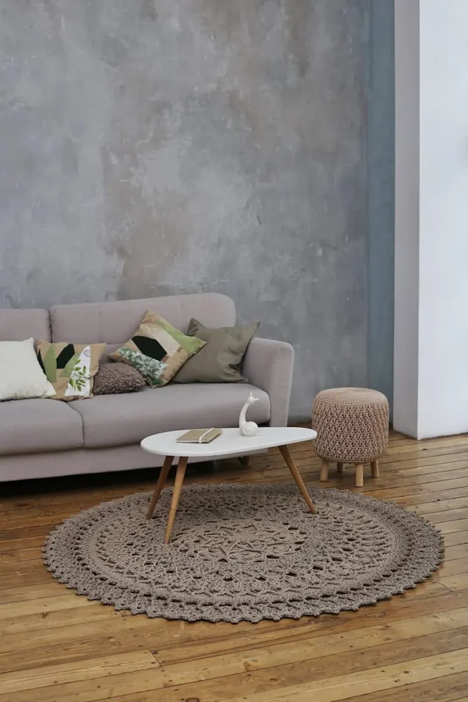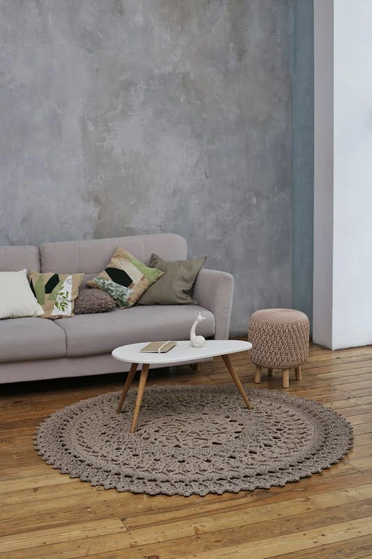 - A high-pile wool or Moroccan-style rug over the flat grey floor.